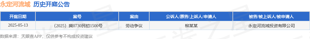本站消息,根据天眼查APP显示,近日公布了一则永定河流域投资有限公司作为被告/被上诉人的开庭公告,详细内容如下: